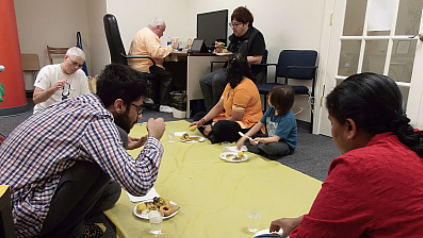 Since March 2021, as highlighted in Planet Princeton, the Princeton Bhakti Vedanta Institute has been distributing sanctified vegetarian meals (prasadam) for free and having kirtan (ecstatic mantra meditation) at the Princeton YMCA on the last Sunday of every month from 1:00-3:00 PM. Whether it’s just for the prasadam, or also to participate in kirtan, all members of the community, their families, and friends, are welcome to join us! The Bhagavat Cultural Immersion is not intended solely for the Indian community, but for anyone who would simply like a vegetarian meal and also for sincere seekers interested in learning more about the nonsectarian approach to spiritual life that Bhagavat philosophy and culture offers. The Bhagavat Cultural Immersion was an idea that our Serving Director, Dr. Bhakti Madhava Puri, had for some time. He decided to implement it to offer some community relief during COVID-19. This has been our primary means of engaging with the community since leaving our Nassau Street office, where the Princeton Bhakti Vedanta Institute had kirtan and prasadam distribution since 2012 (pictured below).